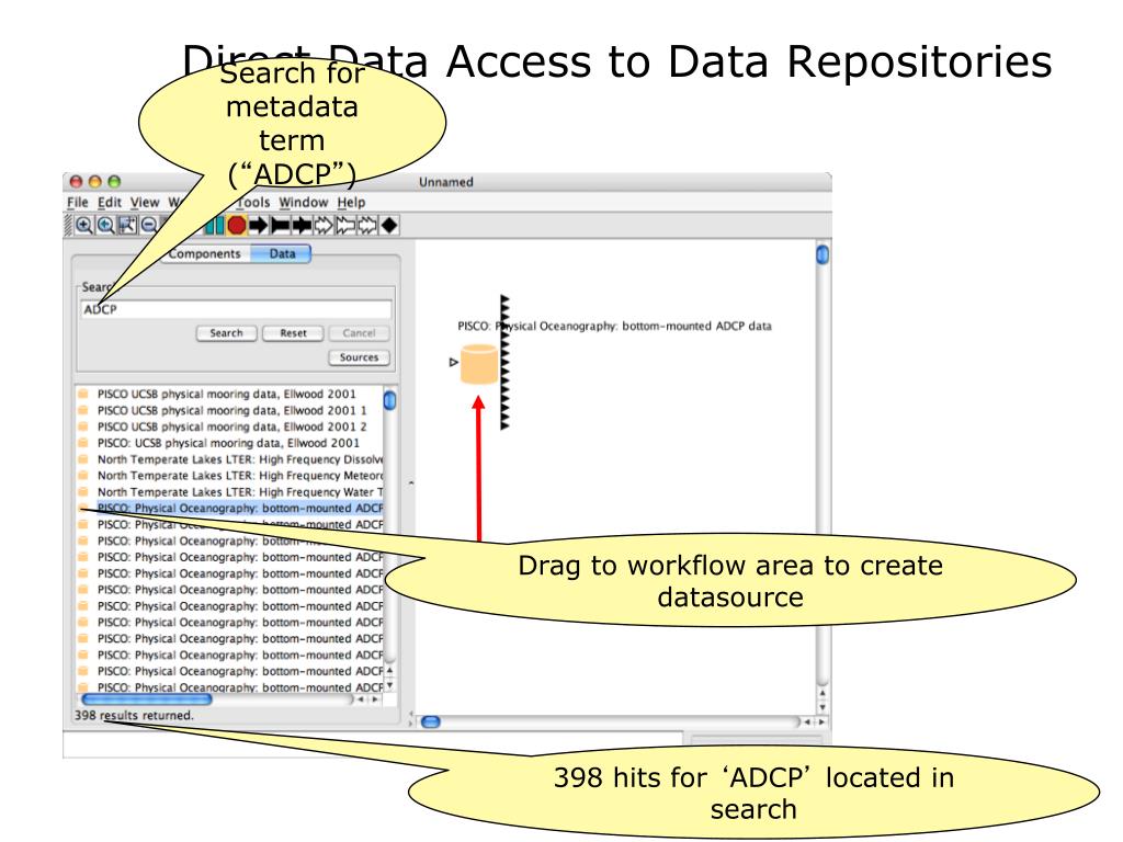 Direct Data Access to Data Repositories Search for metadata term (“ADCP”) Drag to workflow area to create datasource 398 hits for ‘ADCP’ located in search