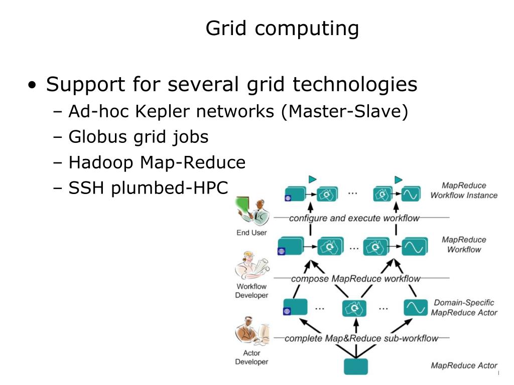Grid computing • Support for several grid technologies • Ad-hoc Kepler networks (Master-Slave) • Globus grid jobs • Hadoop Map-Reduce • SSH plumbed-HPC