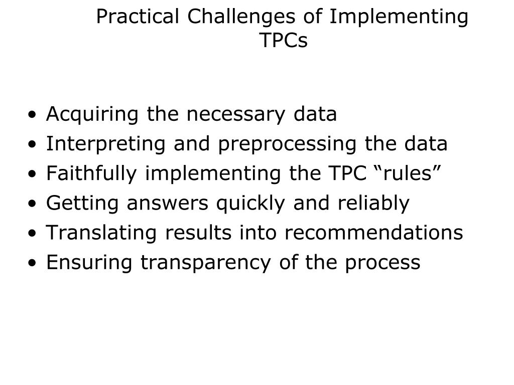 Practical Challenges of Implementing TPCs • Acquiring the necessary data • Interpreting and preprocessing the data • Faithfully implementing the TPC “rules” • Getting answers quickly and reliably • Translating results into recommendations • Ensuring transparency of the process