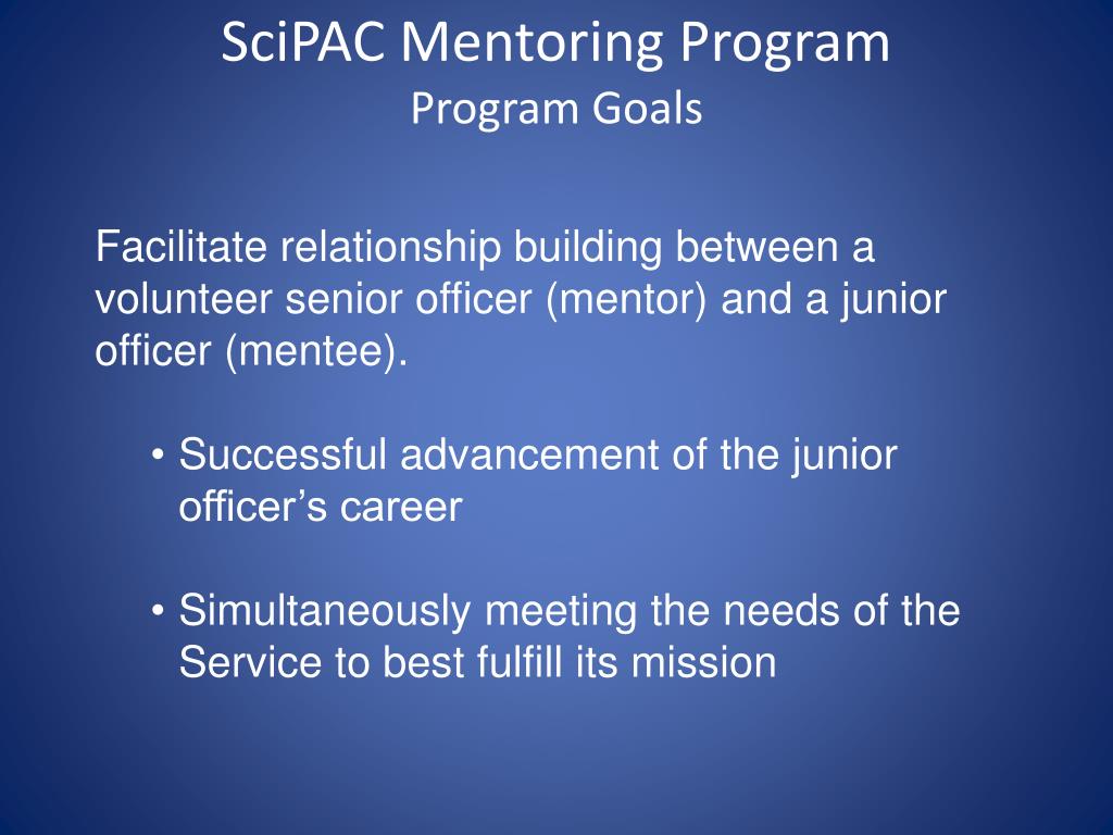 SciPAC Mentoring ProgramProgram Goals • Facilitate relationship building between a volunteer senior officer (mentor) and a junior officer (mentee). • Successful advancement of the junior officer’s career • Simultaneously meeting the needs of the Service to best fulfill its mission