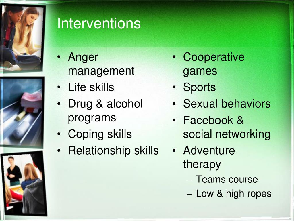 Interventions • Anger management • Life skills • Drug & alcohol programs • Coping skills • Relationship skills • Cooperative games • Sports • Sexual behaviors • Facebook & social networking • Adventure therapy • Teams course • Low & high ropes