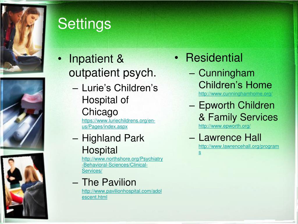 Settings • Inpatient & outpatient psych. • Lurie’s Children’s Hospital of Chicagohttps://www.luriechildrens.org/en-us/Pages/index.aspx • Highland Park Hospitalhttp://www.northshore.org/Psychiatry-Behavioral-Sciences/Clinical-Services/ • The Pavilionhttp://www.pavilionhospital.com/adolescent.html • Residential • Cunningham Children’s Homehttp://www.cunninghamhome.org/ • Epworth Children & Family Serviceshttp://www.epworth.org/ • Lawrence Hallhttp://www.lawrencehall.org/programs