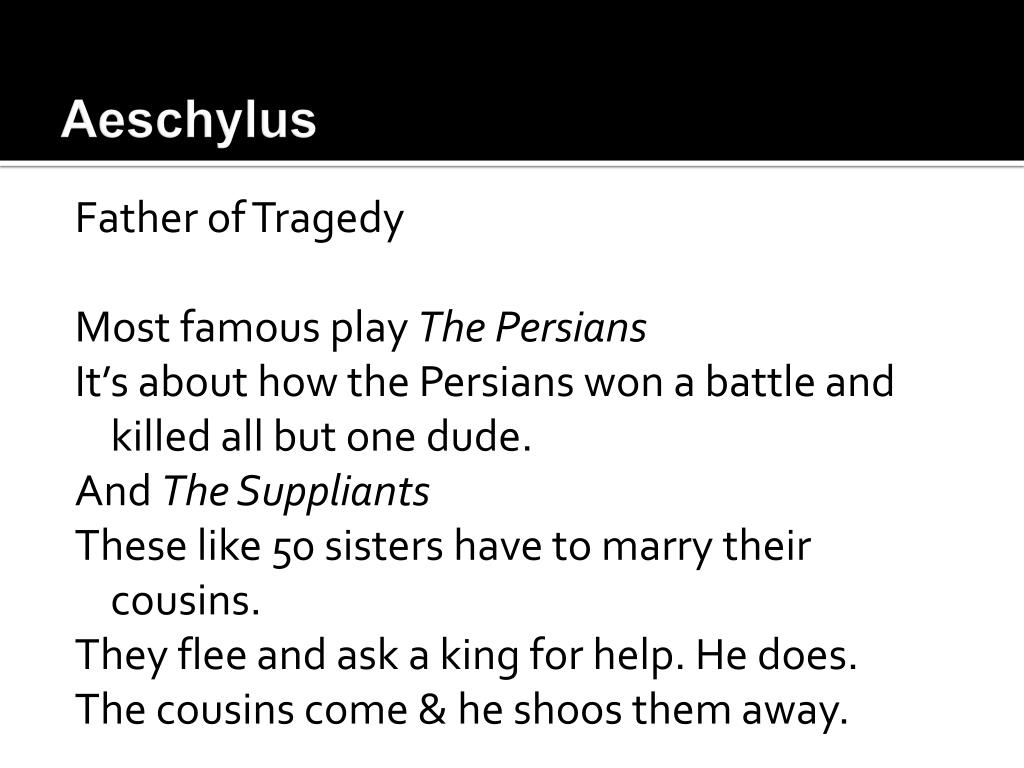 Aeschylus Father of Tragedy Most famous play The Persians It’s about how the Persians won a battle and killed all but one dude. And The Suppliants These like 50 sisters have to marry their cousins. They flee and ask a king for help. He does. The cousins come & he shoos them away.