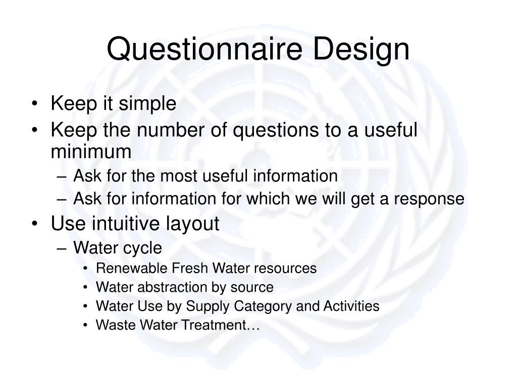 Questionnaire Design • Keep it simple • Keep the number of questions to a useful minimum • Ask for the most useful information • Ask for information for which we will get a response • Use intuitive layout • Water cycle • Renewable Fresh Water resources • Water abstraction by source • Water Use by Supply Category and Activities • Waste Water Treatment…