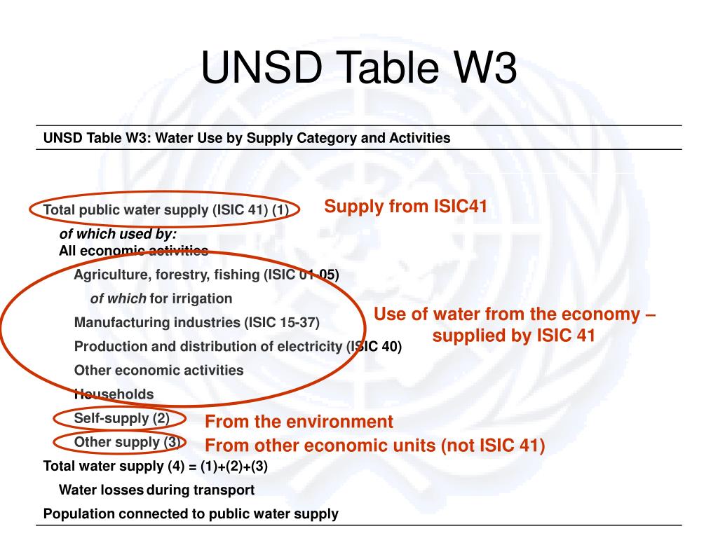 Supply from ISIC41 Use of water from the economy – supplied by ISIC 41 From the environment From other economic units (not ISIC 41) UNSD Table W3