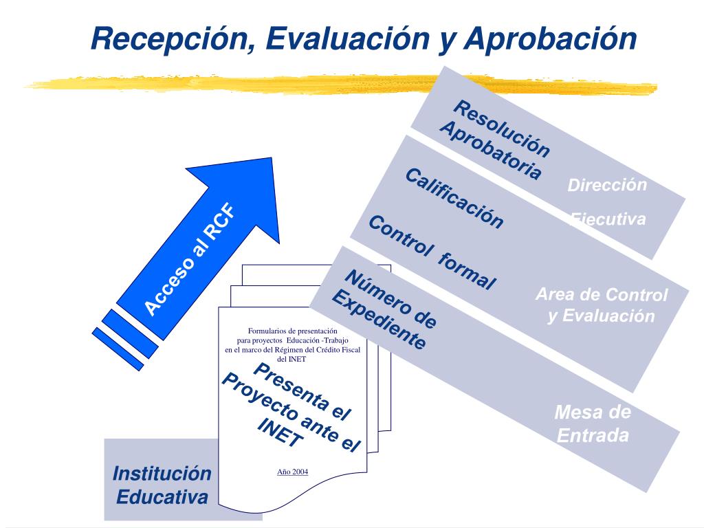 Recepción, Evaluación y Aprobación Resolución Aprobatoria Dirección Ejecutiva Calificación Acceso al RCF Control formal Formularios de presentaciónpara proyectos Educación -Trabajo en el marco del Régimen del Crédito Fiscal del INET Año 2004 Area de Control y Evaluación Número de Expediente Presenta elProyecto ante el INET Mesa de Entrada Institución Educativa