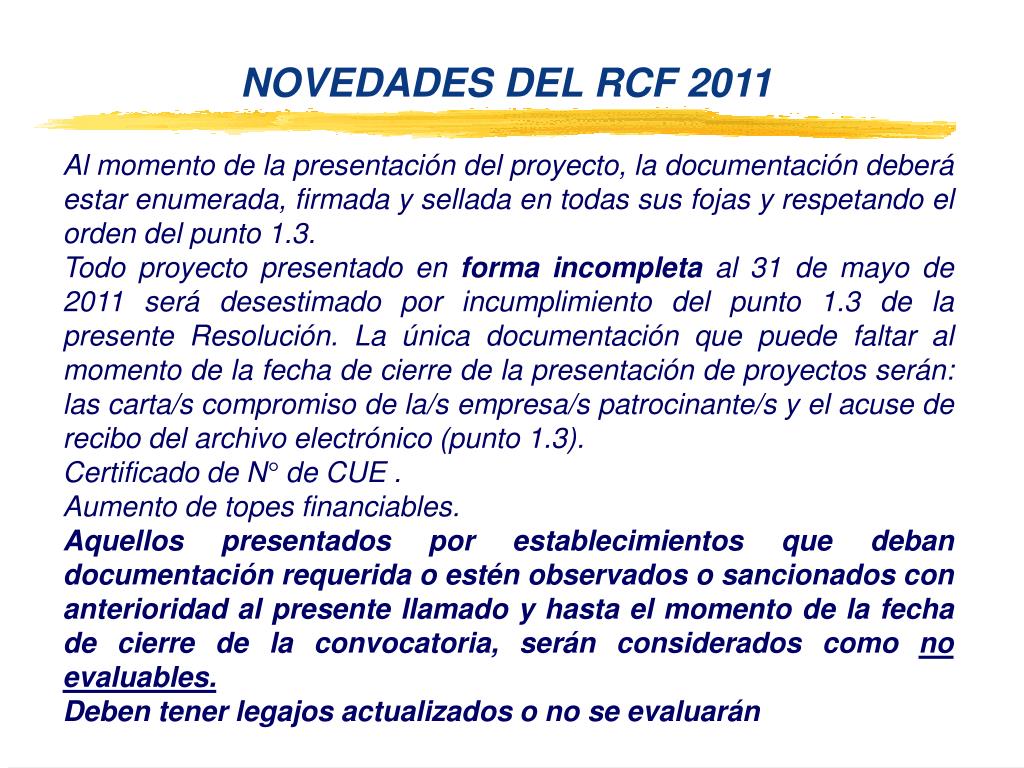 NOVEDADES DEL RCF 2011 Al momento de la presentación del proyecto, la documentación deberá estar enumerada, firmada y sellada en todas sus fojas y respetando el orden del punto 1.3. Todo proyecto presentado en forma incompleta al 31 de mayo de 2011 será desestimado por incumplimiento del punto 1.3 de la presente Resolución. La única documentación que puede faltar al momento de la fecha de cierre de la presentación de proyectos serán: las carta/s compromiso de la/s empresa/s patrocinante/s y el acuse de recibo del archivo electrónico (punto 1.3). Certificado de N° de CUE . Aumento de topes financiables. Aquellos presentados por establecimientos que deban documentación requerida o estén observados o sancionados con anterioridad al presente llamado y hasta el momento de la fecha de cierre de la convocatoria, serán considerados como no evaluables. Deben tener legajos actualizados o no se evaluarán