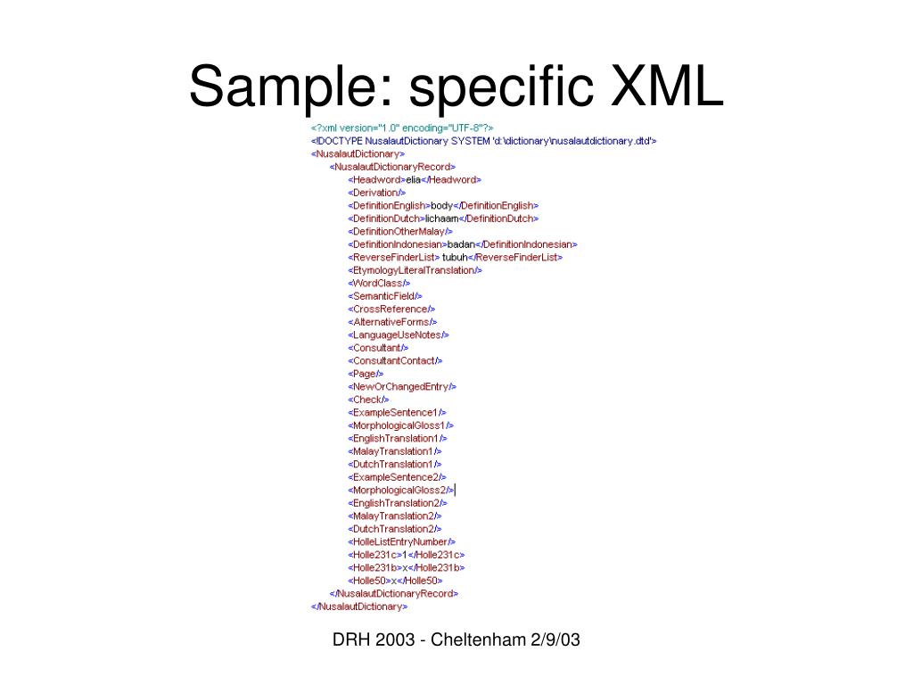 Advantages of XML: Archiving • UNICODE compatibility assured • Besides script possibilities, access to the full International Phonetic Alphabet character set is important for linguists • Explicit coding of data model • Generic file format assures better portability and lifespan DRH 2003 - Cheltenham 2/9/03