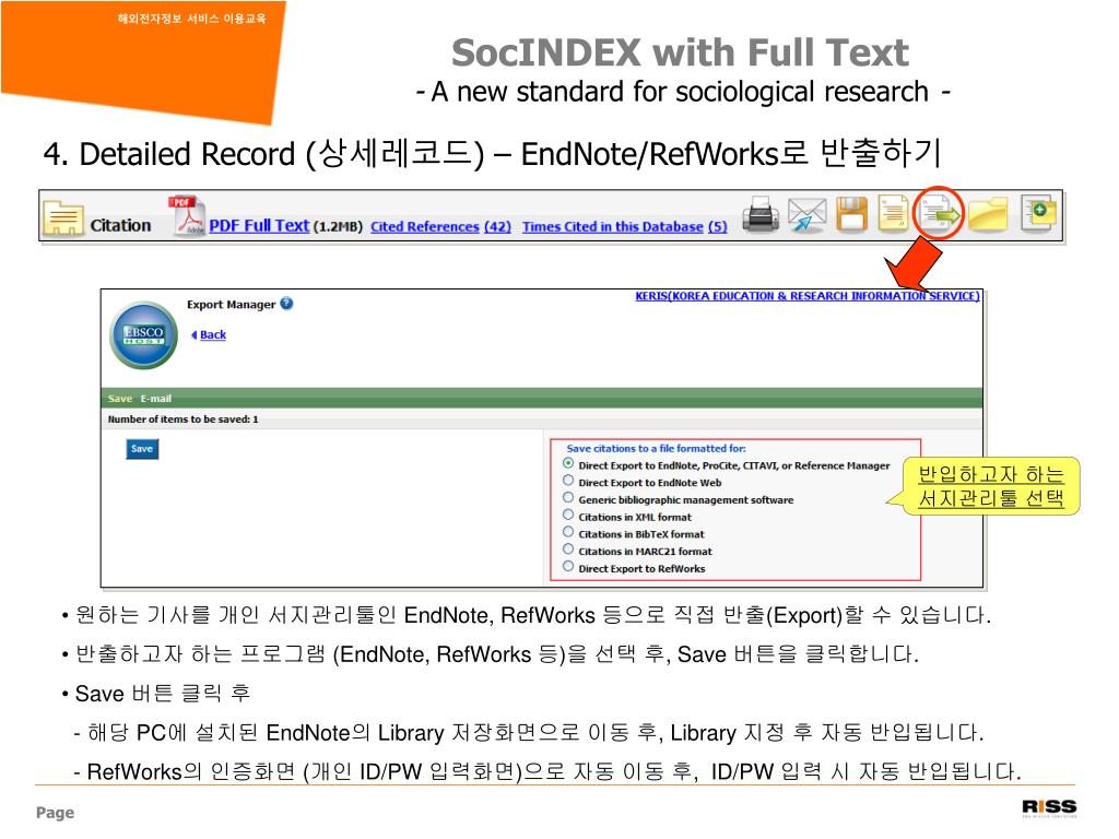 SocINDEX with Full Text - A new standard for sociological research - 4. Detailed Record (상세레코드) – EndNote/RefWorks로 반출하기 반입하고자 하는 서지관리툴 선택 • 원하는 기사를 개인 서지관리툴인 EndNote, RefWorks 등으로 직접 반출(Export)할 수 있습니다. • 반출하고자 하는 프로그램 (EndNote, RefWorks 등)을 선택 후, Save 버튼을 클릭합니다. •Save 버튼 클릭 후 - 해당 PC에 설치된 EndNote의 Library 저장화면으로 이동 후, Library 지정 후 자동 반입됩니다. - RefWorks의 인증화면 (개인 ID/PW 입력화면)으로 자동 이동 후, ID/PW 입력 시 자동 반입됩니다.