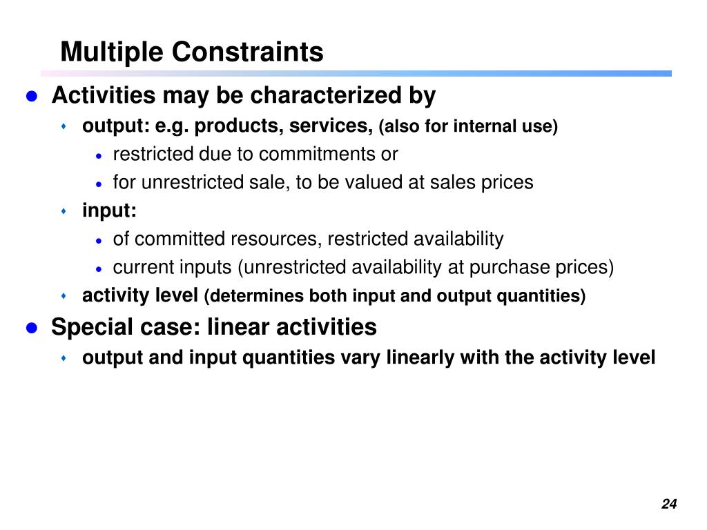 Multiple Constraints • Activities may be characterized by • output: e.g. products, services, (also for internal use) • restricted due to commitments or • for unrestricted sale, to be valued at sales prices • input: • of committed resources, restricted availability • current inputs (unrestricted availability at purchase prices) • activity level (determines both input and output quantities) • Special case: linear activities • output and input quantities vary linearly with the activity level