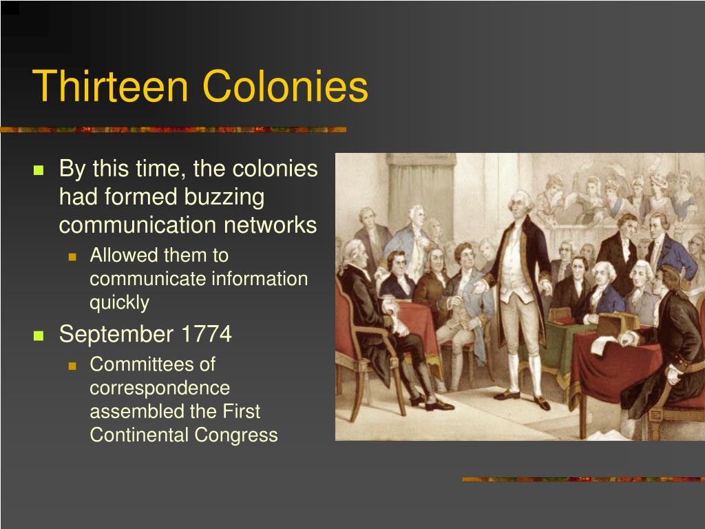 Thirteen Colonies • By this time, the colonies had formed buzzing communication networks • Allowed them to communicate information quickly • September 1774 • Committees of correspondence assembled the First Continental Congress