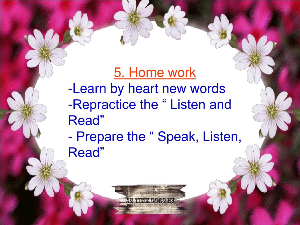 5. Home work • Learn by heart new words • Repractice the “ Listen and Read” • Prepare the “ Speak, Listen, Read”