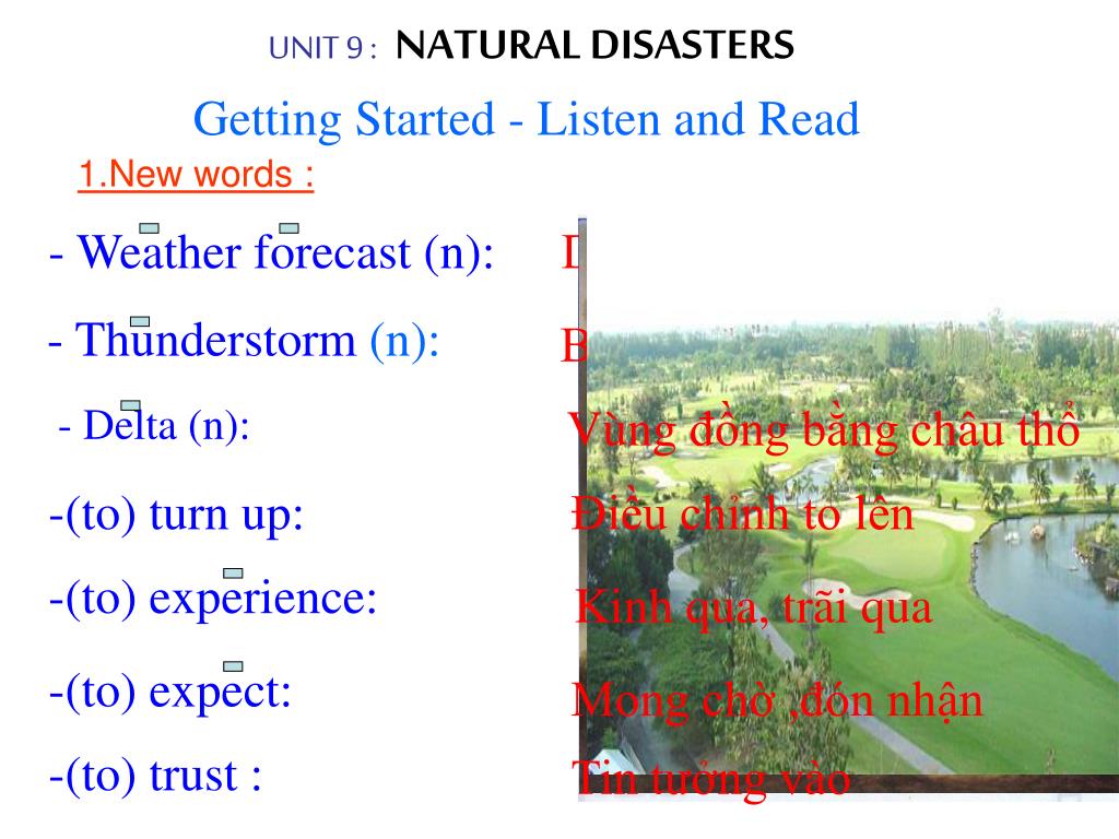 UNIT 9 :NATURAL DISASTERS Getting Started - Listen and Read 1.New words : - Weather forecast (n) Dự báo thời tiết - Thunderstorm (n) Bão có sấm sét - Delta (n) Vùngđồng bằng châu thổ -(to) turn up Điều chỉnh to lên -(to) experience Kinh qua, trãi qua -(to) expect Mong chờ ,đón nhận -(to) trust : Tin tưởng vào