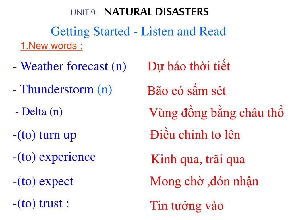 UNIT 9 :NATURAL DISASTERS Getting Started - Listen and Read 1.New words : - Weather forecast (n): Dự báo thời tiết - Thunderstorm (n): Bão có sấm sét - Delta (n): Vùngđồng bằng châu thổ -(to) turn up: Điều chỉnh to lên -(to) experience: Kinh qua, trãi qua -(to) expect: Mong chờ ,đón nhận -(to) trust : Tin tưởng vào