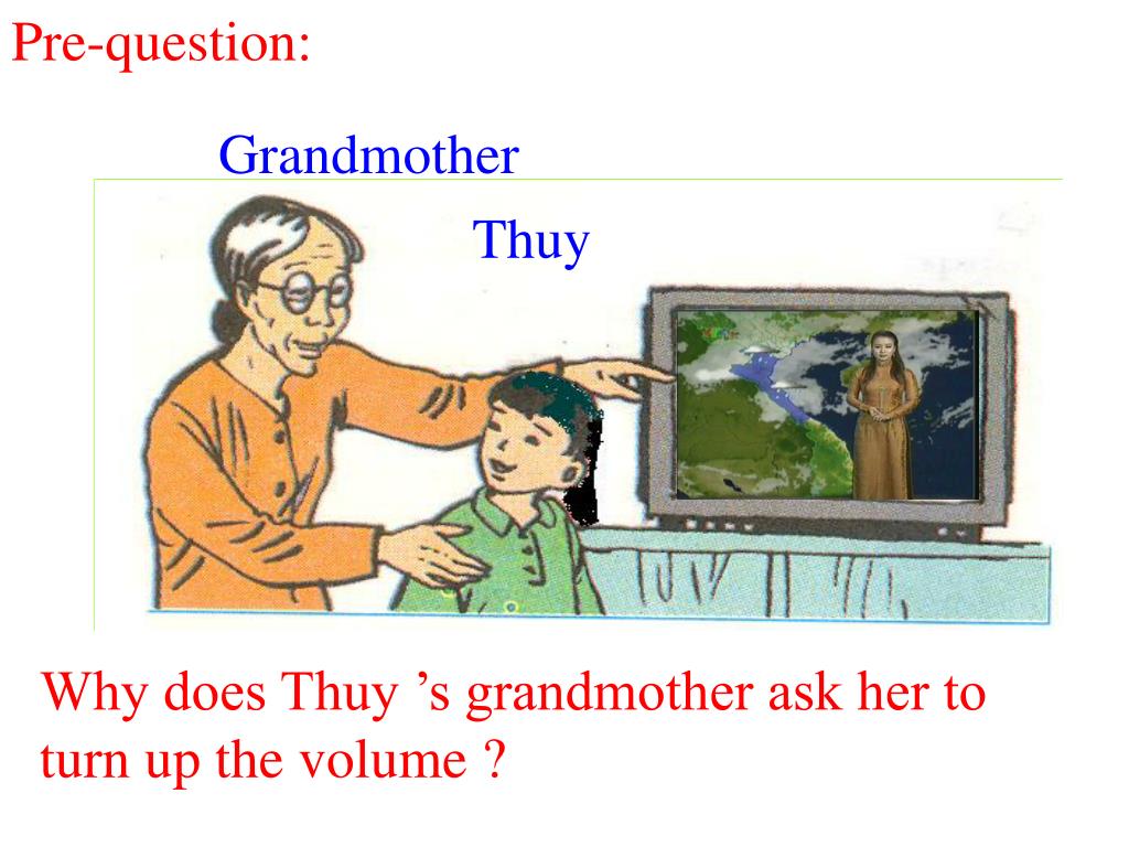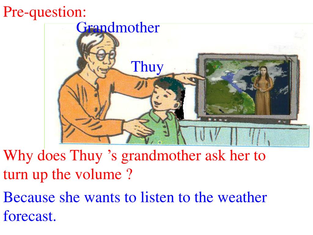Pre-question: Grandmother Thuy Why does Thuy ’s grandmother ask her to turn up the volume ? Because she wants to listen to the weather forecast.