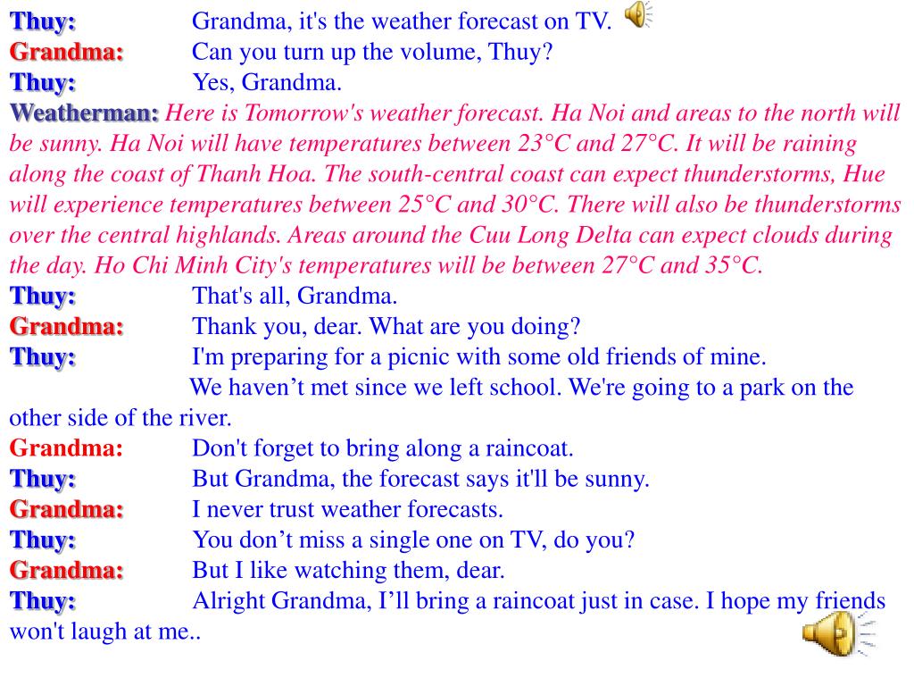 Thuy: Grandma, it's the weather forecast on TV. Grandma: Can you turn up the volume, Thuy? Thuy: Yes, Grandma. Weatherman:Here is Tomorrow's weather forecast. Ha Noi and areas to the north will be sunny. Ha Noi will have temperatures between 23°C and 27°C. It will be raining along the coast of Thanh Hoa. The south-central coast can expect thunderstorms, Hue will experience temperatures between 25°C and 30°C. There will also be thunderstorms over the central highlands. Areas around the Cuu Long Delta can expect clouds during the day. Ho Chi Minh City's temperatures will be between 27°C and 35°C. Thuy: That's all, Grandma. Grandma: Thank you, dear. What are you doing? Thuy: I'm preparing for a picnic with some old friends of mine. We haven’t met since we left school. We're going to a park on the other side of the river. Grandma: Don't forget to bring along a raincoat. Thuy: But Grandma, the forecast says it'll be sunny. Grandma: I never trust weather forecasts. Thuy: You don’t miss a single one on TV, do you? Grandma: But I like watching them, dear. Thuy: Alright Grandma, I’ll bring a raincoat just in case. I hope my friends won't laugh at me..