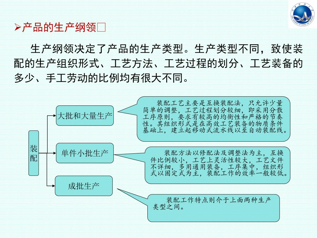 装配工艺主要是互换装配法,只允许少量简单的调整,工艺过程划分较细,即采用分散工序原则,要求有较高的均衡性和严格的节奏性。其组织形式是在高效工艺装备的物质条件基础上,建立起移动式流水线以至自动装配线。装配工艺主要是互换装配法,只允许少量简单的调整,工艺过程划分较细,即采用分散工序原则,要求有较高的均衡性和严格的节奏性。其组织形式是在高效工艺装备的物质条件基础上,建立起移动式流水线以至自动装配线。 大批和大量生产 装 配 单件小批生产 装配方法以修配法及调整法为主,互换件比例较小,工艺上灵活性较大,工艺文件不详细,多用通用装备,工序集中,组织形式以固定式为主,装配工作的效率一般较低。 成批生产 装配工作特点则介于上面两种生产类型之间。 • 产品的生产纲领 • 生产纲领决定了产品的生产类型。生产类型不同,致使装配的生产组织形式、工艺方法、工艺过程的划分、工艺装备的多少、手工劳动的比例均有很大不同。