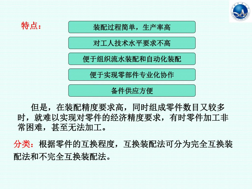 装配过程简单,生产率高 对工人技术水平要求不高 便于组织流水装配和自动化装配 便于实现零部件专业化协作 备件供应方便 特点: 但是,在装配精度要求高,同时组成零件数目又较多时,就难以实现对零件的经济精度要求,有时零件加工非常困难,甚至无法加工。 分类:根据零件的互换程度,互换装配法可分为完全互换装配法和不完全互换装配法。