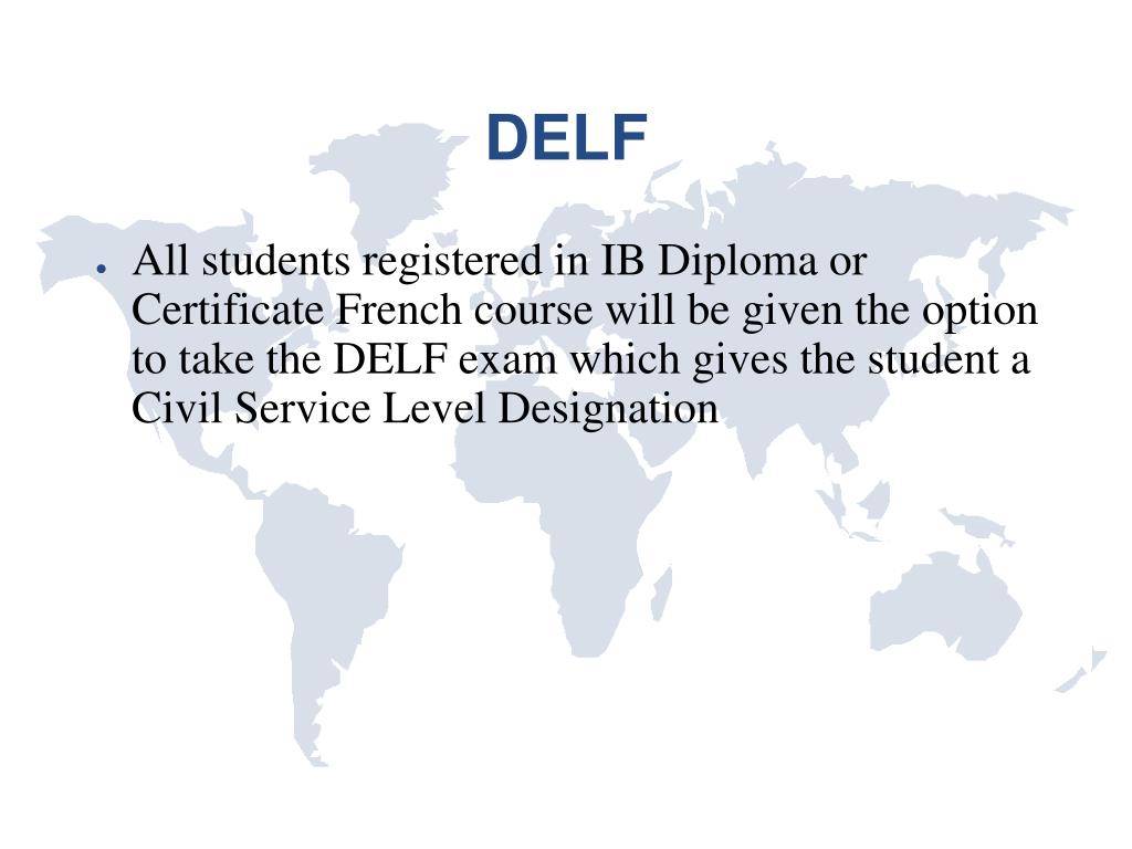 All students registered in IB Diploma or Certificate French course will be given the option to take the DELF exam which gives the student a Civil Service Level Designation DELF