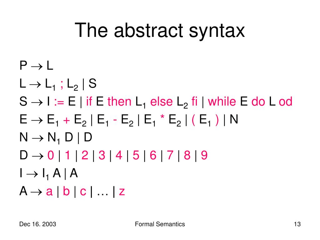 The abstract syntax P L L L1; L2 | S S I := E | if E then L1else L2fi | while E do L od E E1+ E2 | E1- E2 | E1* E2 | ( E1) | N N N1 D | D D 0 | 1 | 2 | 3 | 4 | 5 | 6 | 7 | 8 | 9 I I1 A | A A a | b | c | … | z Formal Semantics