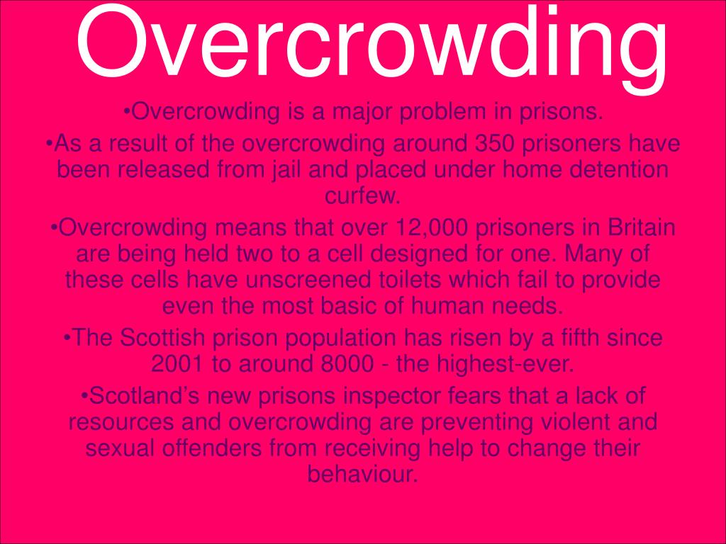 Overcrowding Overcrowding is a major problem in prisons. As a result of the overcrowding around 350 prisoners have been released from jail and placed under home detention curfew. Overcrowding means that over 12,000 prisoners in Britain are being held two to a cell designed for one. Many of these cells have unscreened toilets which fail to provide even the most basic of human needs. The Scottish prison population has risen by a fifth since 2001 to around 8000 - the highest-ever. Scotland’s new prisons inspector fears that a lack of resources and overcrowding are preventing violent and sexual offenders from receiving help to change their behaviour.