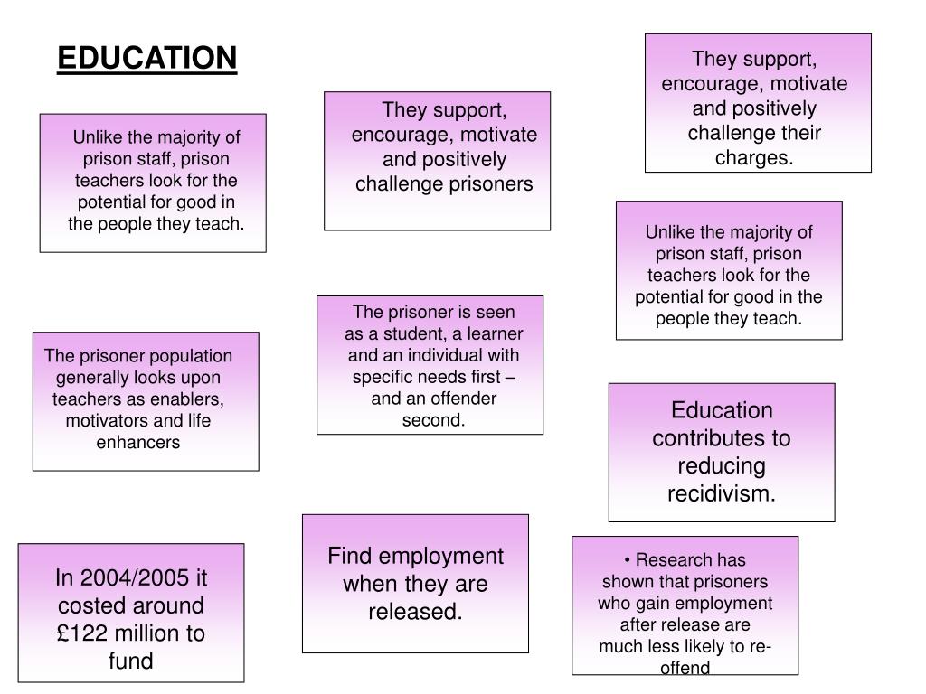 EDUCATION They support, encourage, motivate and positively challenge their charges. They support, encourage, motivate and positively challenge prisoners Unlike the majority of prison staff, prison teachers look for the potential for good in the people they teach. Unlike the majority of prison staff, prison teachers look for the potential for good in the people they teach. The prisoner is seen as a student, a learner and an individual with specific needs first – and an offender second. The prisoner population generally looks upon teachers as enablers, motivators and life enhancers Education contributes to reducing recidivism. Find employment when they are released. • Research has shown that prisoners who gain employment after release are much less likely to re-offend In 2004/2005 it costed around £122 million to fund