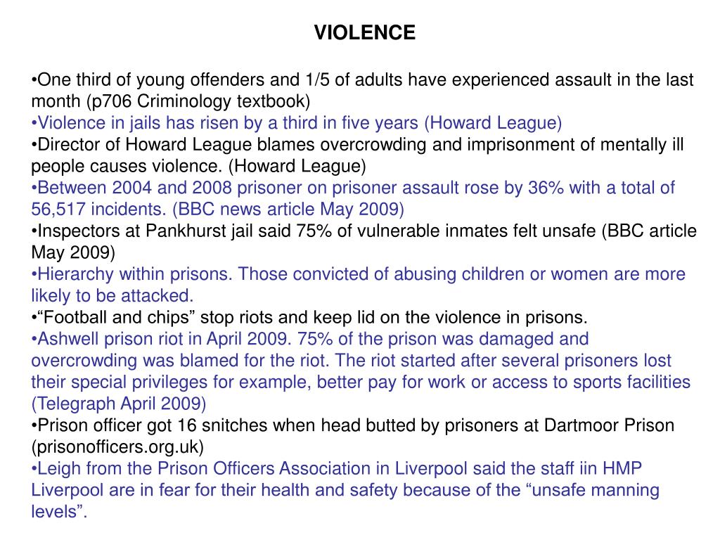 VIOLENCE • One third of young offenders and 1/5 of adults have experienced assault in the last month (p706 Criminology textbook) • Violence in jails has risen by a third in five years (Howard League) • Director of Howard League blames overcrowding and imprisonment of mentally ill people causes violence. (Howard League) • Between 2004 and 2008 prisoner on prisoner assault rose by 36% with a total of 56,517 incidents. (BBC news article May 2009) • Inspectors at Pankhurst jail said 75% of vulnerable inmates felt unsafe (BBC article May 2009) • Hierarchy within prisons. Those convicted of abusing children or women are more likely to be attacked. • “Football and chips” stop riots and keep lid on the violence in prisons. • Ashwell prison riot in April 2009. 75% of the prison was damaged and overcrowding was blamed for the riot. The riot started after several prisoners lost their special privileges for example, better pay for work or access to sports facilities (Telegraph April 2009) • Prison officer got 16 snitches when head butted by prisoners at Dartmoor Prison (prisonofficers.org.uk) • Leigh from the Prison Officers Association in Liverpool said the staff iin HMP Liverpool are in fear for their health and safety because of the “unsafe manning levels”.