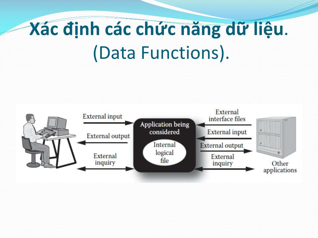 Xácđịnhcácchứcnăngdữliệu(Data Functions). Data Function thểhiệnkhíacạnhdữliệutrongcácchứcnăngcungcấpchokháchhàng. Nóđặctrưngbởihaiyếutố ILF (Internal Logical File) và EIF (External Interface File). Việcxácđịnh ILF hay EIF cầnđượcthựchiệntrướckhitiếnhànhchuẩnhóa (normalize) dữliệu.