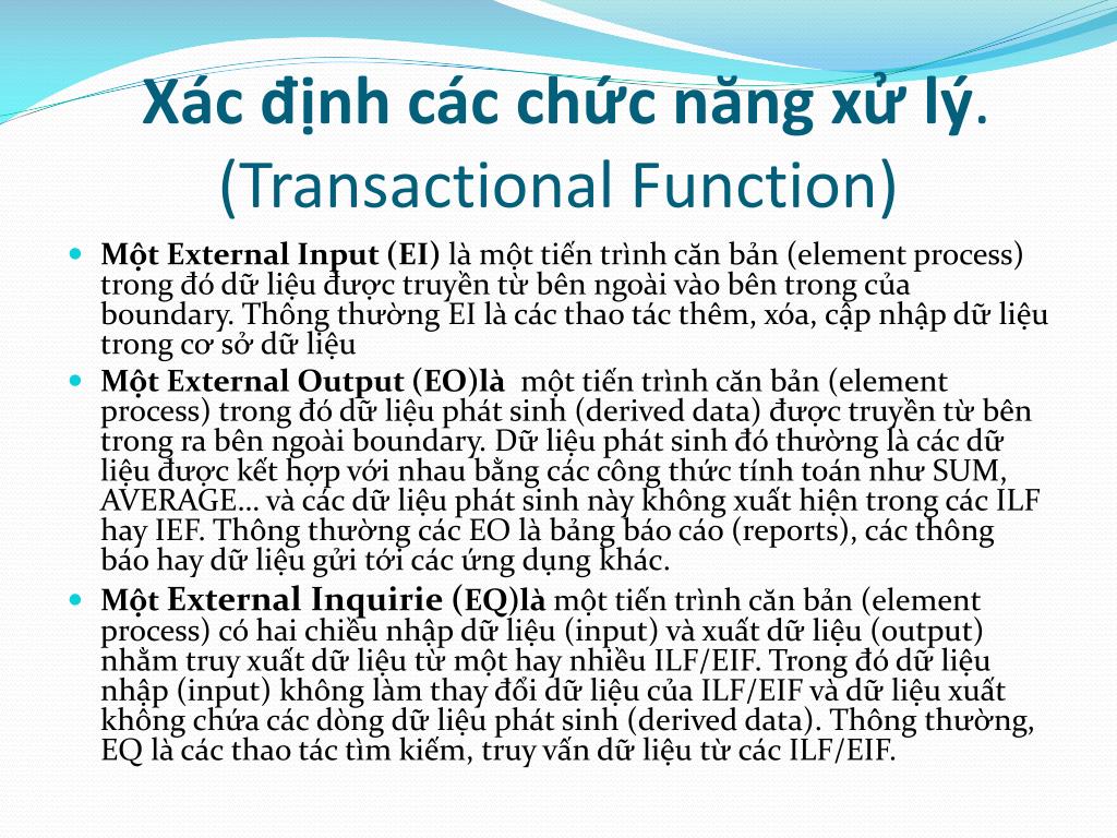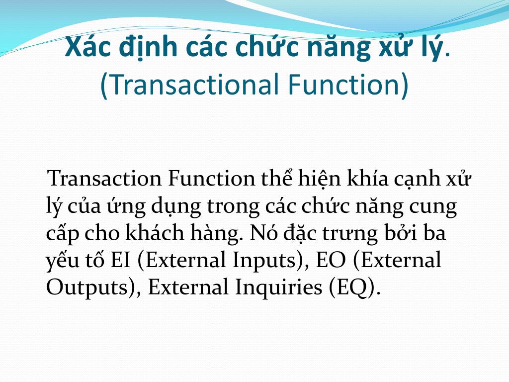 Xácđịnhcácchứcnăngxửlý.(Transactional Function) Transaction Function thểhiệnkhíacạnhxửlýcủaứngdụngtrongcácchứcnăngcungcấpchokháchhàng. Nóđặctrưngbởibayếutố EI (External Inputs), EO (External Outputs), External Inquiries (EQ).