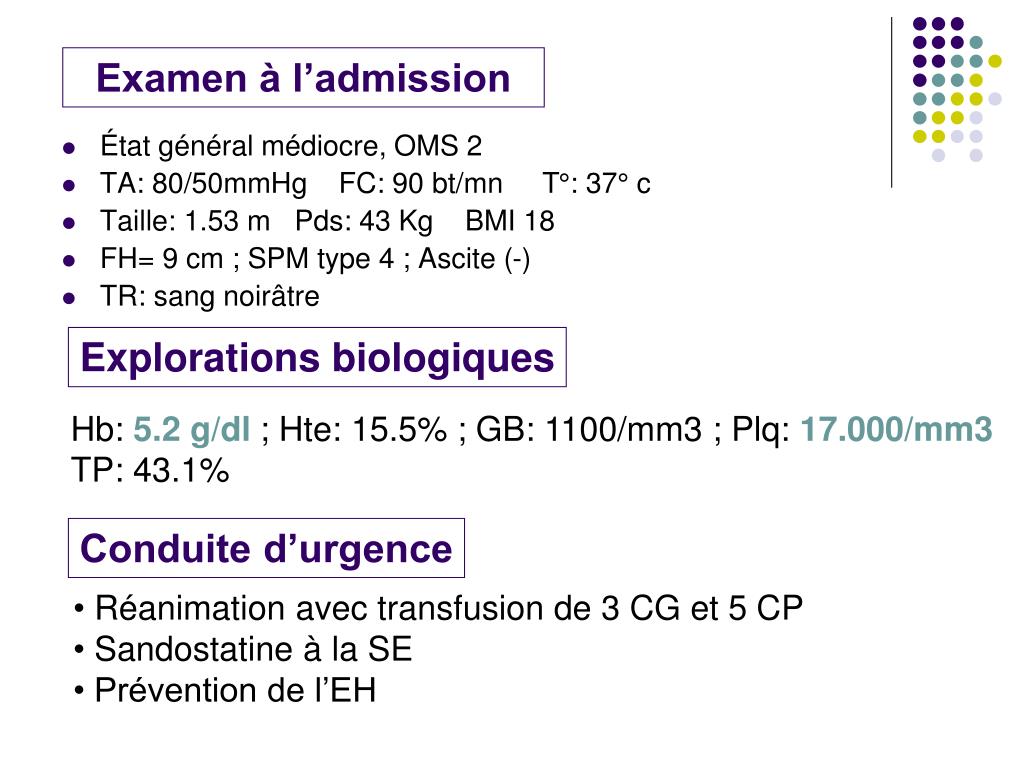 Examen à l’admission • État général médiocre, OMS 2 • TA: 80/50mmHg FC: 90 bt/mn T°: 37° c • Taille: 1.53 m Pds: 43 Kg BMI 18 • FH= 9 cm ; SPM type 4 ; Ascite (-) • TR: sang noirâtre Explorations biologiques Hb: 5.2 g/dl ; Hte: 15.5% ; GB: 1100/mm3 ; Plq: 17.000/mm3 TP: 43.1% Conduite d’urgence • Réanimation avec transfusion de 3 CG et 5 CP • Sandostatine à la SE • Prévention de l’EH