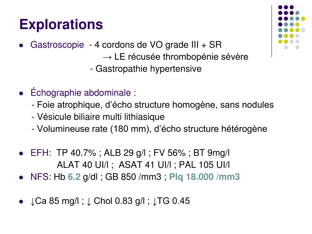 Explorations • Gastroscopie -4 cordons de VO grade III + SR → LE récusée thrombopénie sévère - Gastropathie hypertensive • Échographie abdominale : - Foie atrophique, d’écho structure homogène, sans nodules - Vésicule biliaire multi lithiasique - Volumineuse rate (180 mm), d’écho structure hétérogène • EFH:TP 40.7% ; ALB 29 g/l ; FV 56% ; BT 9mg/l ALAT 40 UI/l ; ASAT 41 UI/l ; PAL 105 UI/l • NFS: Hb 6.2 g/dl ; GB 850 /mm3 ; Plq 18.000 /mm3 • ↓Ca 85 mg/l ; ↓ Chol 0.83 g/l ; ↓TG 0.45