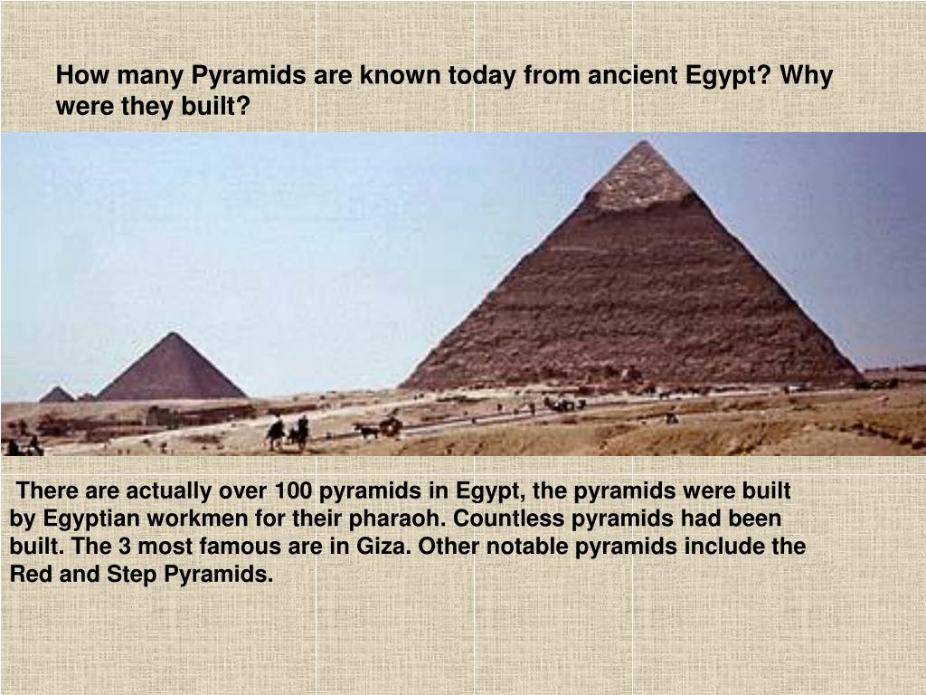 How many Pyramids are known today from ancient Egypt? Why were they built? There are actually over 100 pyramids in Egypt, the pyramids were built by Egyptian workmen for their pharaoh.Countless pyramids had been built. The 3 most famous are in Giza. Other notable pyramids include the Red and Step Pyramids.