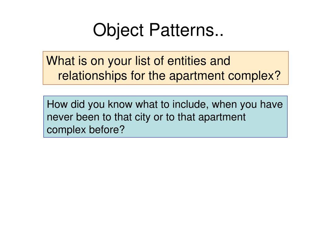 Object Patterns.. What is on your list of entities and relationships for the apartment complex? How did you know what to include, when you have never been to that city or to that apartment complex before?