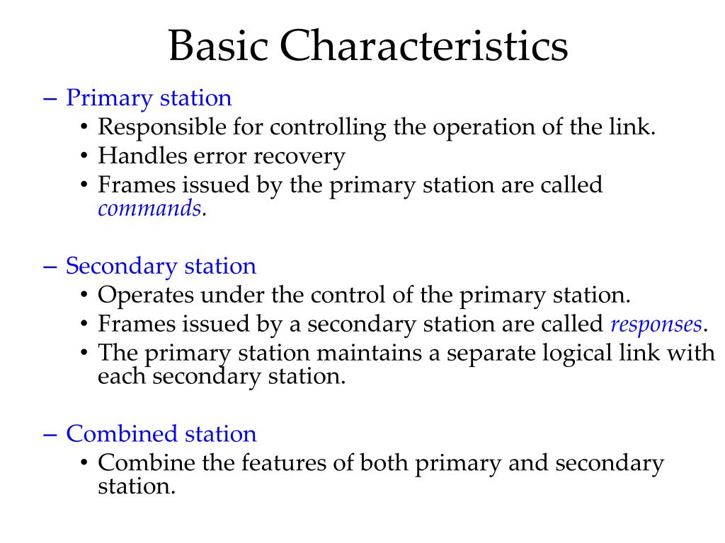 Basic Characteristics • Primary station • Responsible for controlling the operation of the link. • Handles error recovery • Frames issued by the primary station are called commands. • Secondary station • Operates under the control of the primary station. • Frames issued by a secondary station are called responses. • The primary station maintains a separate logical link with each secondary station. • Combined station • Combine the features of both primary and secondary station.