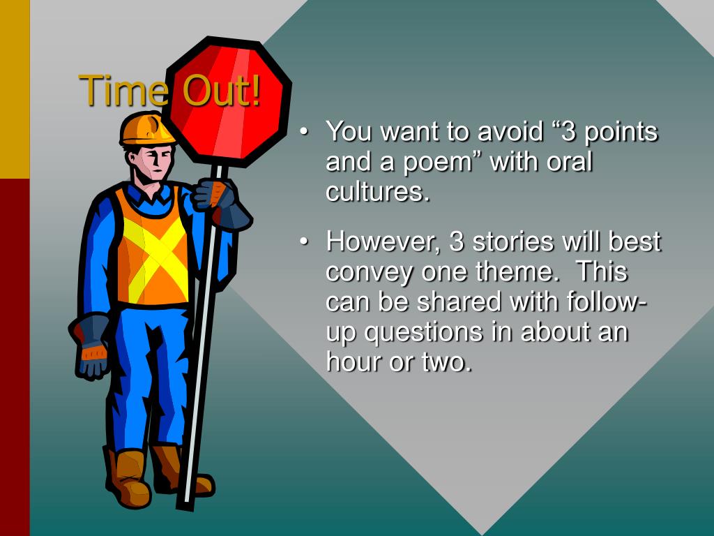 Time Out! • You want to avoid “3 points and a poem” with oral cultures. • However, 3 stories will best convey one theme. This can be shared with follow-up questions in about an hour or two.