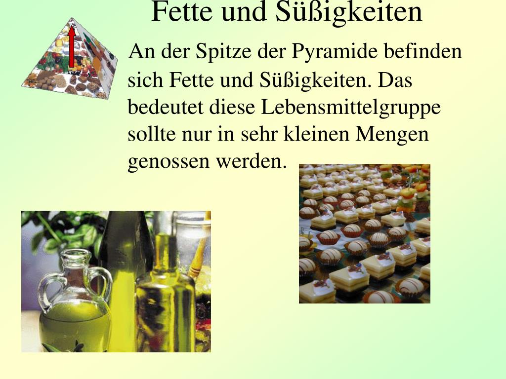 Fette und SüßigkeitenAn der Spitze der Pyramide befinden sich Fette und Süßigkeiten. Das bedeutet diese Lebensmittelgruppe sollte nur in sehr kleinen Mengen genossen werden.