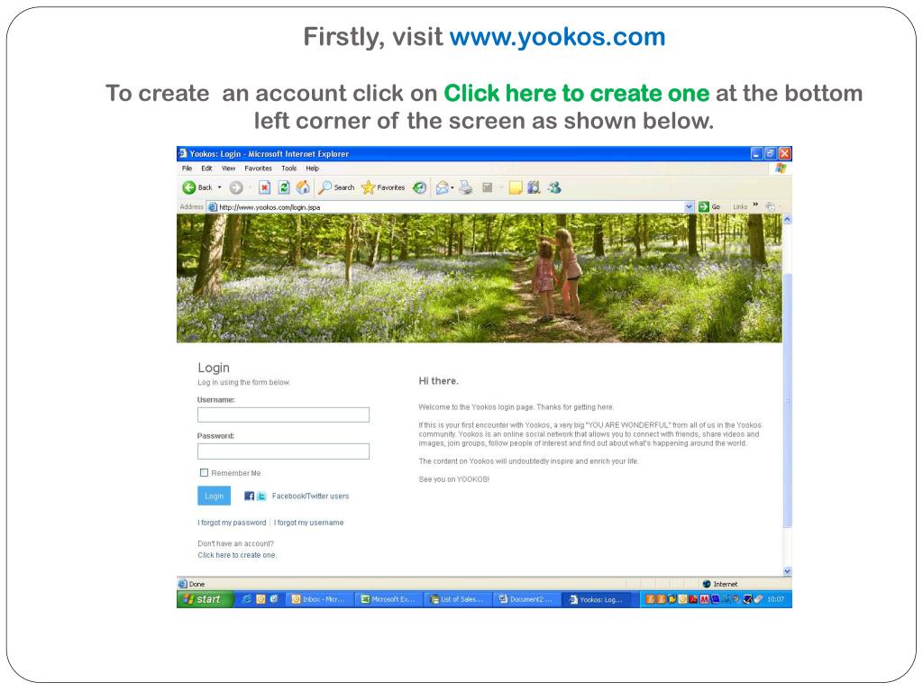 Firstly, visit www.yookos.comTo create an account click on Click here to create one at the bottom left corner of the screen as shown below.