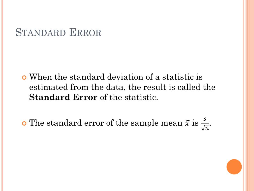 Standard Error • When the standard deviation of a statistic is estimated from the data, the result is called the Standard Error of the statistic. • The standard error of the sample mean is .