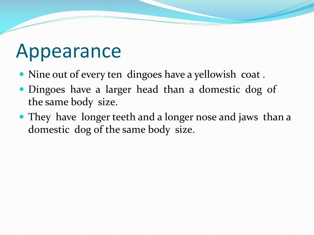 Appearance • Nine out of every ten dingoes have a yellowish coat . • Dingoes have a larger head than a domestic dog of the same body size. • They have longer teeth and a longer nose and jaws than a domestic dog of the same body size.