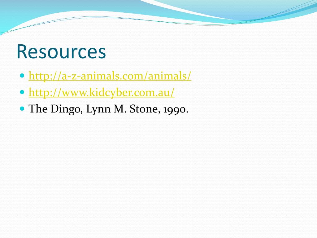 Resources • http://a-z-animals.com/animals/ • http://www.kidcyber.com.au/ • The Dingo, Lynn M. Stone, 1990.