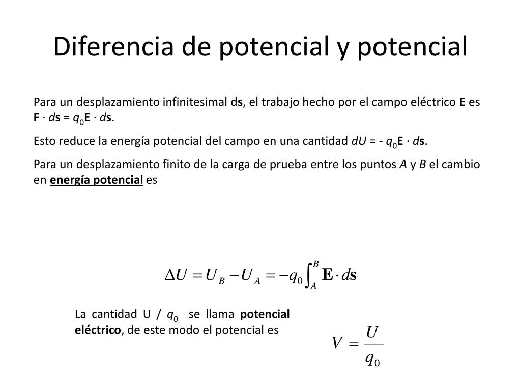Diferencia de potencial y potencial Para un desplazamiento infinitesimal ds, el trabajo hecho por el campo eléctrico E es F · ds= q0E · ds. Esto reduce la energía potencial del campo en una cantidad dU = - q0E · ds. Para un desplazamiento finito de la carga de prueba entre los puntos A y B el cambio en energía potencial es La cantidad U / q0 se llama potencial eléctrico, de este modo el potencial es