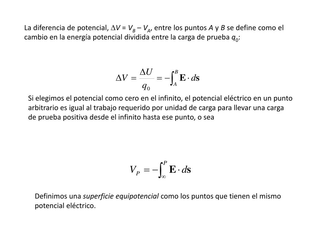 La diferencia de potencial, DV = VB – VA, entre los puntos A y B se define como el cambio en la energía potencial dividida entre la carga de prueba q0: Si elegimos el potencial como cero en el infinito, el potencial eléctrico en un punto arbitrario es igual al trabajo requerido por unidad de carga para llevar una carga de prueba positiva desde el infinito hasta ese punto, o sea Definimos una superficie equipotencial como los puntos que tienen el mismo potencial eléctrico.