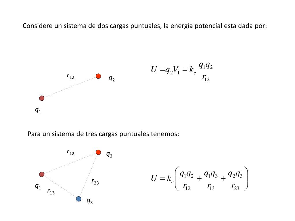 Considere un sistema de dos cargas puntuales, la energía potencial esta dada por: r12 q2 q1 Para un sistema de tres cargas puntuales tenemos: r12 q2 r23 q1 r13 q3