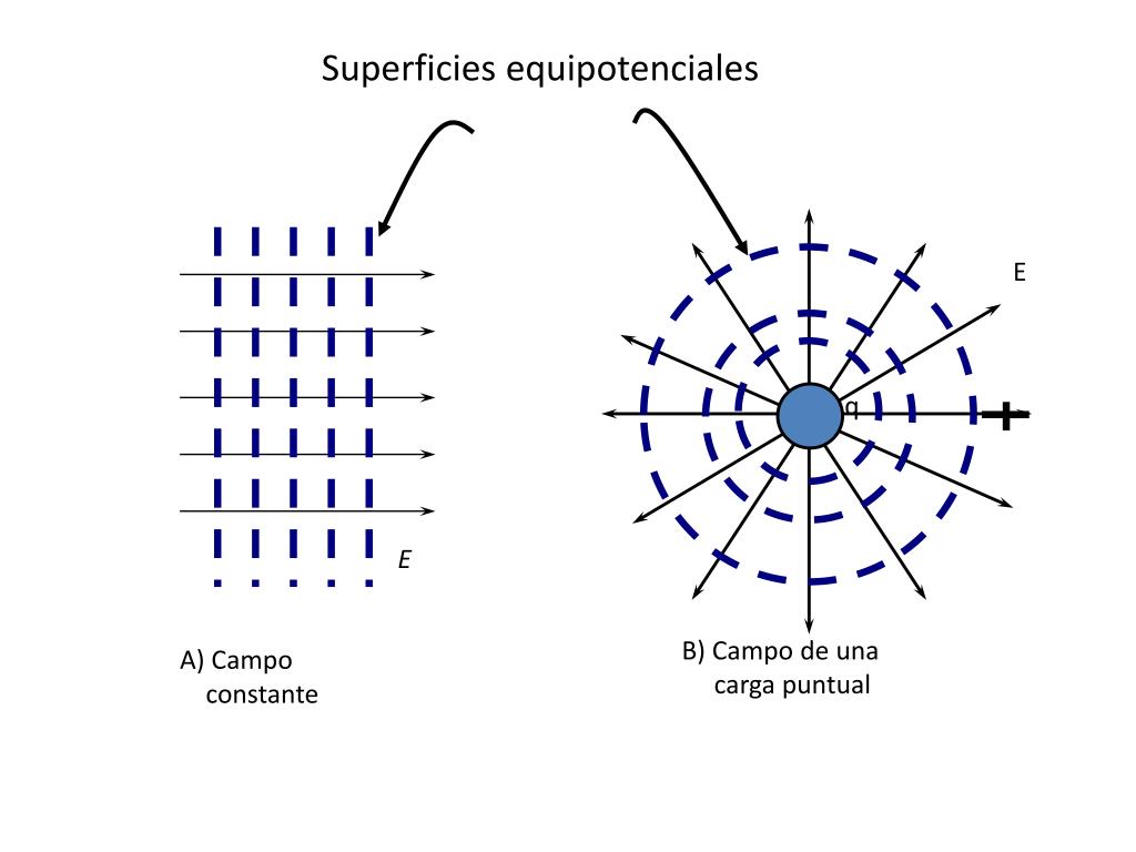 E Superficies equipotenciales E q B) Campo de una carga puntual A) Campo constante