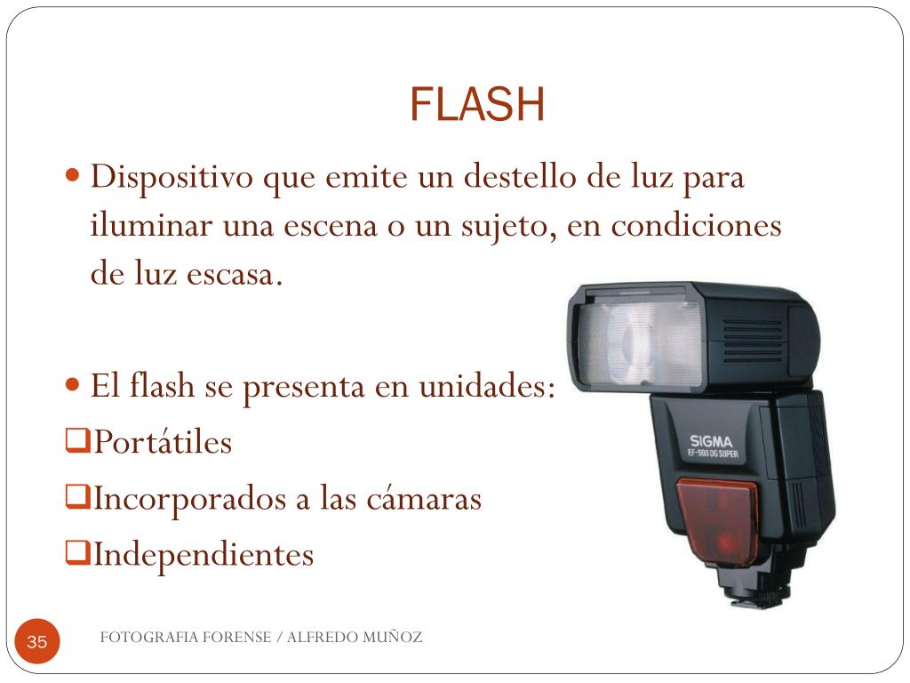 FLASH • Dispositivo que emite un destello de luz para iluminar una escena o un sujeto, en condiciones de luz escasa. • El flash se presenta en unidades: • Portátiles • Incorporados a las cámaras • Independientes FOTOGRAFIA FORENSE / ALFREDO MUÑOZ