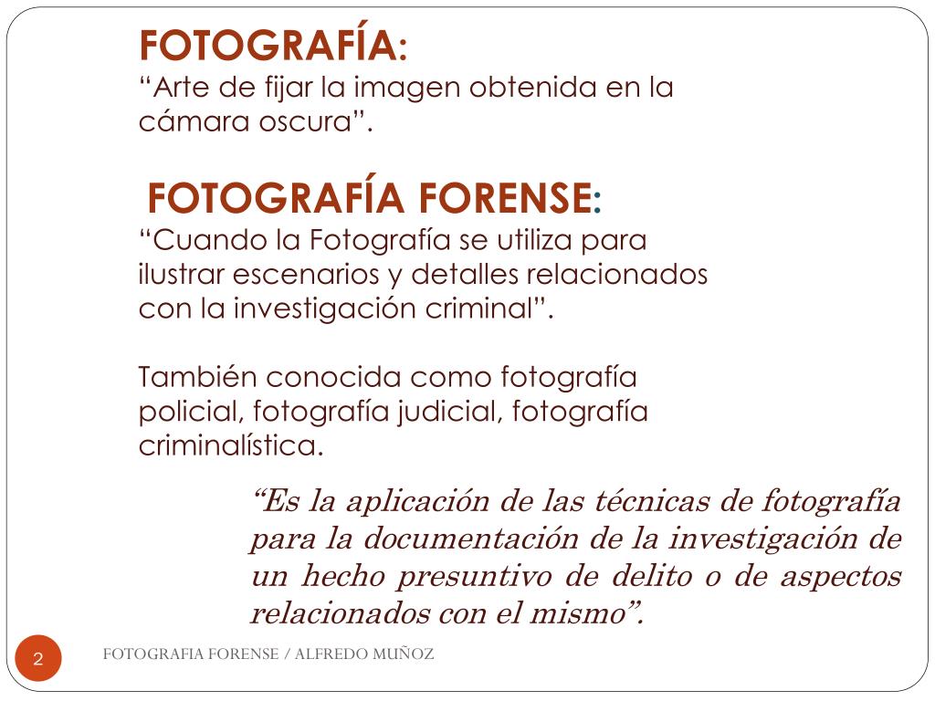 FOTOGRAFÍA:“Arte de fijar la imagen obtenida en la cámara oscura”.FOTOGRAFÍA FORENSE:“Cuando la Fotografía se utiliza para ilustrar escenarios y detalles relacionados con la investigación criminal”. También conocida como fotografía policial, fotografía judicial, fotografía criminalística. “Es la aplicación de las técnicas de fotografía para la documentación de la investigación de un hecho presuntivo de delito o de aspectos relacionados con el mismo”. FOTOGRAFIA FORENSE / ALFREDO MUÑOZ