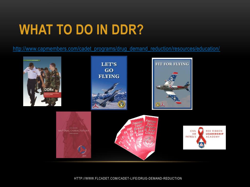 Drug demand reduction DDR Vision "To be a leading force in America’s drug demand reduction strategy through the education and development of tomorrow’s leaders in voluntary community service for a drug-free world." DDR Mission "The Civil Air Patrol Drug Demand Reduction Program assists squadrons, groups, wings, and regions to instill an aggressive, positive, drug-free attitude in CAP members, AF families, DoD civilians, and school-age children through a comprehensive program that: Promotes CAP as a positive community service lifestyle; encourages youth to remain in school; focuses on drug abuse education, prevention, and awareness; and provides positive activities as an alternative to drugs and gang violence." http://www.flcadet.com/cadet-life/drug-demand-reduction