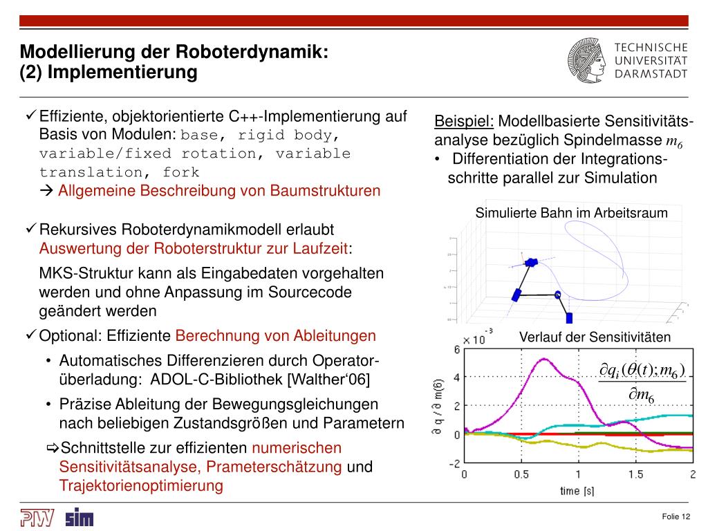 Modellierung der Roboterdynamik:(2) Implementierung • Effiziente, objektorientierte C++-Implementierung auf Basis von Modulen: base, rigid body, variable/fixedrotation, variable translation, fork • Allgemeine Beschreibung von Baumstrukturen • Rekursives Roboterdynamikmodell erlaubt Auswertung der Roboterstruktur zur Laufzeit: • MKS-Struktur kann als Eingabedaten vorgehalten werden und ohne Anpassung im Sourcecode geändert werden • Optional: Effiziente Berechnung von Ableitungen • Automatisches Differenzieren durch Operator-überladung: ADOL-C-Bibliothek [Walther‘06] • Präzise Ableitung der Bewegungsgleichungen nach beliebigen Zustandsgrößen und Parametern • Schnittstelle zur effizienten numerischen Sensitivitätsanalyse, Prameterschätzungund Trajektorienoptimierung • Beispiel:Modellbasierte Sensitivitäts-analyse bezüglich Spindelmasse m6 • Differentiation der Integrations-schritte parallel zur Simulation Simulierte Bahn im Arbeitsraum Verlauf der Sensitivitäten