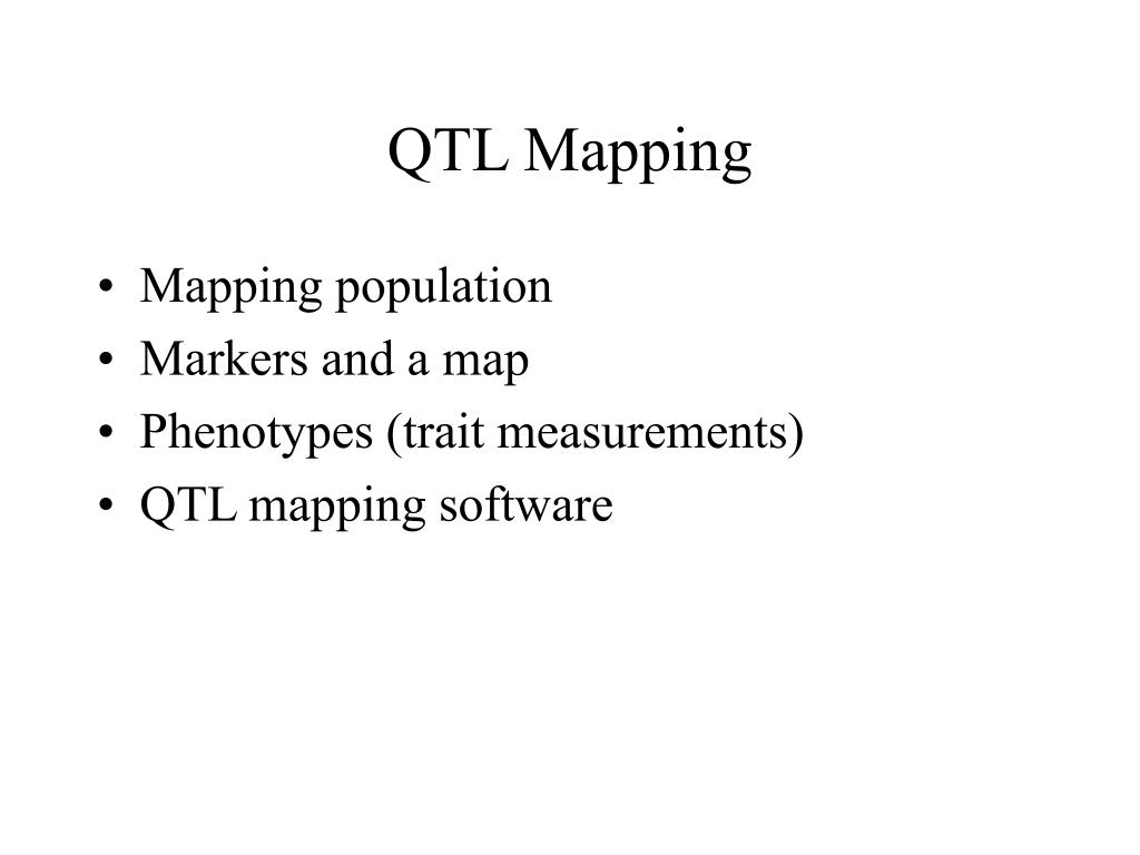 QTL Mapping • Mapping population • Markers and a map • Phenotypes (trait measurements) • QTL mapping software