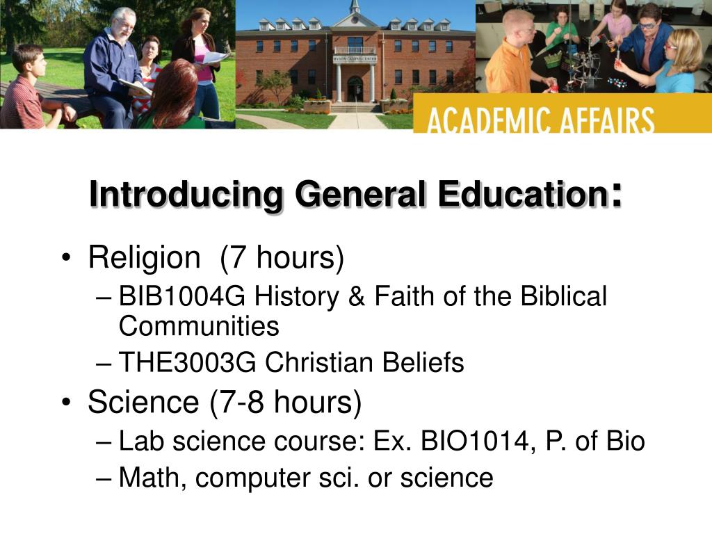 Introducing General Education: • Religion (7 hours) • BIB1004G History & Faith of the Biblical Communities • THE3003G Christian Beliefs • Science (7-8 hours) • Lab science course: Ex. BIO1014, P. of Bio • Math, computer sci. or science